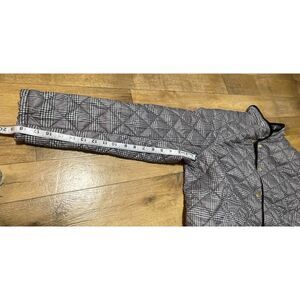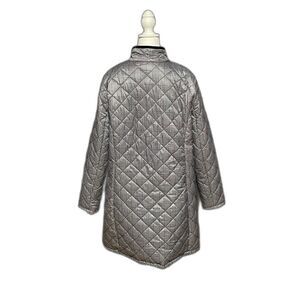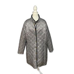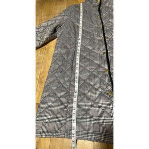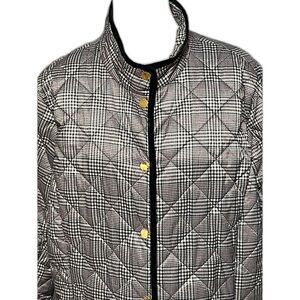 Liz Claiborne coat, quilted houndstooth, plaid diamond jacket, women’s XL coat, longline puffer coat, fall winter outerwear, gold button jacket, classic black white red coat, lightweight quilted coat, warm casual jacket, stylish winter coat, office outerwear, designer quilted jacket