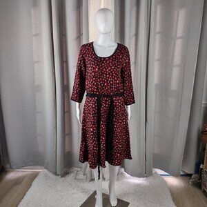 Liz Claiborne women's midi dress featuring a modern red and black abstract floral dot print. Crafted from a cozy sweater-knit rayon blend, this dress offers a flattering scoop neckline, 3/4 sleeves, and a removable waist tie that enhances the fit-and-flare silhouette. Easy to dress up or down for work, dinner, or casual weekends.