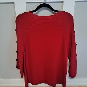 Cozy and stylish Liz Claiborne knit sweater in a bold red. Features button detailing along both sleeves and shoulders, crew neckline, and a tunic length that pairs perfectly with jeans, skirts, or leggings. Soft cotton-blend fabric for comfort and easy wear.