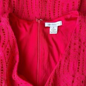 This Liz Claiborne dress is a women's size 16, featuring an A-line style with a V-neck and sleeveless design. The knee-length dress is crafted from red lace, ideal for party or cocktail occasions. It has a back zipper closure and requires dry cleaning.