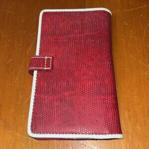 Stylish red textured wallet with a secure snap closure. Features a sleek design with white accents. In great condition. Y2k