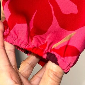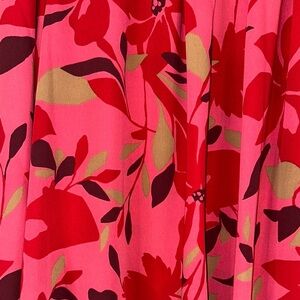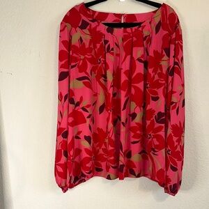 This relaxed-fit blouse by Liz Claiborne features a vibrant mix of red and pink hues with black floral silhouettes. The pleated design and flowing fabric offer a comfortable and stylish look, perfect for casual outings.