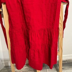 Liz Claiborne Bold Red Dress great for all occasions, has a fun pattern on look on bottom of dress has a belt to tie. This is used in good condition. This was just below my knee and I’m 5’7. The belt might need to be ironed from time to time or it gets a bunched up look.