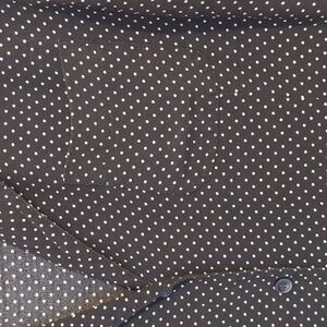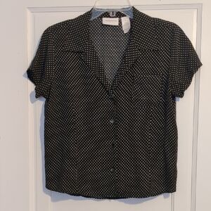 Chic black blouse with white polka dots. Short sleeves and button-up front. Pocket on the chest, flattering darts.