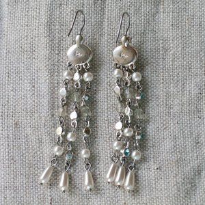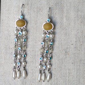 Gently used Liz Claiborne Blue Rhinestone, bead, faux pearl, and green inlay Chandelier dangle Earring