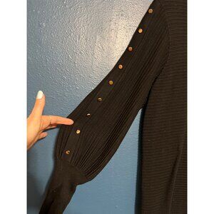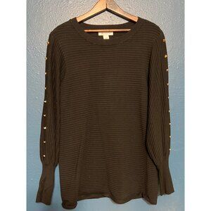 This Liz Claiborne sweater, expertly crafted with a blend of rayon and nylon, delivers sophistication and style. The ribbed texture accentuates its design, while metallic button details on the sleeves add elegance. Ideal for cooler weather, it offers comfort and a polished look for any professional setting.
