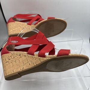 Liz Claiborne, Rockelle, Red, Wedge Sandals, Size 9, M, Medium, Stretch, Back Zip, Zipper, Preowned, Excellent Condition, Women's, Ladies, Footwear, Shoes, Summer, Spring, Casual, Dressy, Vacation, Comfortable, Chic, Stylish, Vibrant, Pop of Color, Modern, Classic, Versatile,