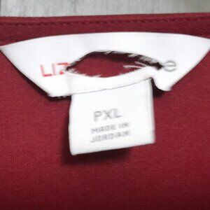 Rich burgundy color, gathered/pleating at scoop neck, cap sleeves. Material is thick, warm, and cozy: 96% polyester, 4% spandex.