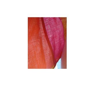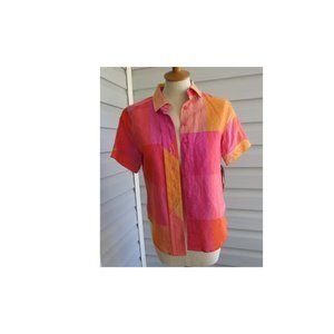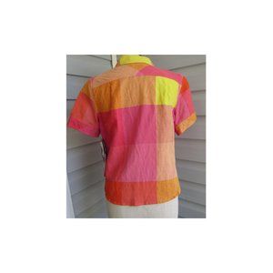 This Liz Claiborne Short Sleeve Blouse has large 5.5" x 5.5" large checkered pattern in pink, orange, and yellow. It is 55% linen and 45% cotton. It is a very tailored blouse that is suitable for a warm summer day. There is an extra button in a black envelope attached to the blouse. The front and back are rounded and the side seams are shorter. The blouse is bright and cheery.