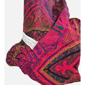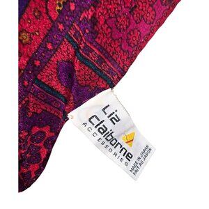 Luxurious Liz Claiborne silk scarf in stunning red, purple, and blue blue hues, featuring a paisley and hibiscus floral pattern. This scarf is perfect to add a touch of elegance to any outfit.