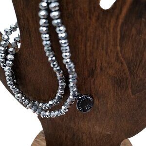 Liz Claiborne silver tone double strand stretch bracelet featuring faceted beads and a sparkling pavé crystal bead accent
