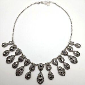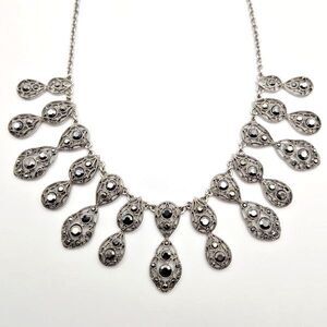 Liz Claiborne Silvertone Double Teardrop Black Rhinestone Statement Necklace