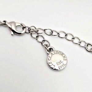 The Liz Claiborne Silvertone Double Teardrop Black Rhinestone Statement Necklace is a stylish and eye-catching accessory that features unique teardrop-shaped pendants adorned with black rhinestones. The necklace is signed by Liz Claiborne and has a lobster closure for easy wear. The adjustable statement piece is crafted with glass rhinestones, measuring 16 inches in length and featuring a cable chain design. Perfect for adding a touch of glamour to any outfit, this necklace is a must-have for those who love bold and statement jewelry.