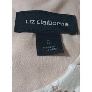 The Liz Claiborne Sleeveless Floral Lace Sheath Shift Dress is a cream colored dress made of polyester with a floral pattern. It has a round neckline, a sleeveless design, and a zipper closure. The dress is lined and features crochet accents. It is a midi dress with a sheath style and a regular size type. size 6.