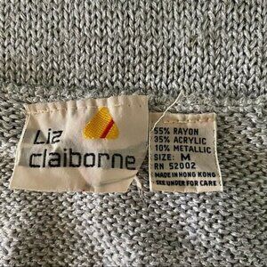 Liz Claiborne Sleeveless Silver Sparkly Top. 55% Rayon, 35% Acrylic, 10% Metallic. Size Medium with approximate measurements laying flat: 18” pit to pit, 22” length measured from top of shoulder.