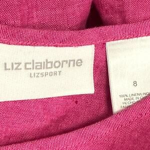 The Liz Claiborne Sport 100% Linen Pink Sleeveless Maxi Dress is a stylish and versatile option for women size 8. This striped dress features a high neckline, fringe trim accents, and a zip closure. Made from machine washable linen fabric, this long dress is perfect for various occasions including travel, casual outings, and business meetings. With a collarless design and a vibrant pink color, this dress is a fashionable choice for the summer, fall, and spring seasons. The Liz Claiborne brand ensures quality and sophistication in this chic silhouette.