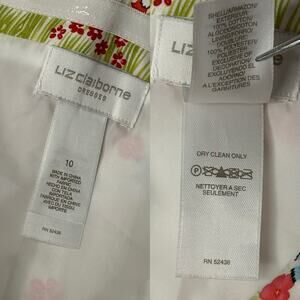 Liz Claiborne Spring Parade Strapless A-line Dress 10 White Floral Cottage NWT. Fully lined with flattering bias cut skirt. Dry clean for the longevity of the garment. In overall excellent New condition. Does have a tiny color transfer under front now. It's not super noticable with the pattern of the fabric. Also a dirt spot near side seam has not been treated as the dress is new with tags. No known rips, tears, holes, stains or defects. Cottagecore, Feminine, Party, Church, Wedding.