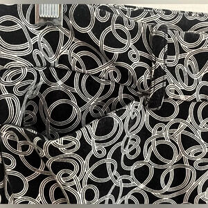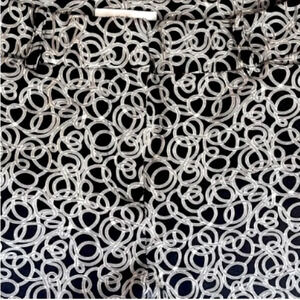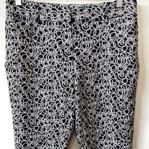 Gently used, very good condition,Liz Claiborne, Size 6, super soft and stretchy, comfortable, black and white design,front and back pockets, front zipper with hooks and button closure, please see pictures for approximate measurements of waist, rise, inseam, and leg opening at bottom hem