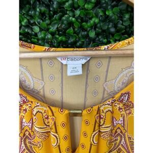 The Liz Claiborne Summer dress in women's size XXL is a vibrant yellow floral dress with a sleeveless design and round neckline. Made from lightweight and stretchy rayon fabric, this long A-Line dress is perfect for summer and spring occasions like travel, parties, or casual wear. The classic and colorful theme of this dress makes it a stylish and comfortable option for warm weather. Easy to care for with machine-washable instructions, this dress from Liz Claiborne is a must-have for any woman looking for a flattering and trendy piece of clothing.