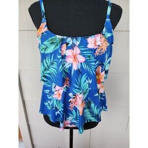 Liz Claiborne Swim Top Blue/Floral Layered Ruffled Adjust Straps Size 10.