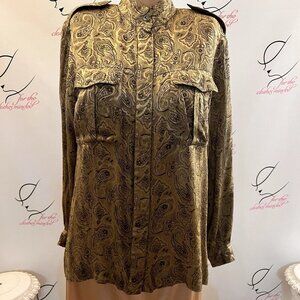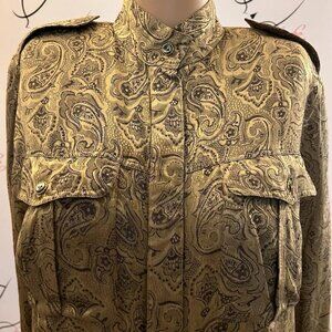 Liz Claiborne. Sz 6. Oversized. Rayon. Tan Gold Long Sleeve Paisley Stand Up Collar. Shoulder to hem 26.5". Sleeve 23". Button cuff. Bust 20/40". Shoulder tab. Hidden button placket.