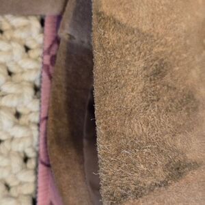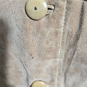 Western or boho tan suede shirt jacket. Fully lined with button front. Does need some cleaning especially on one side of bottom hen and one cuff. Please see all pics. Color is the lighter tan not the darker color in closeups.