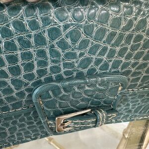 Add a pop of color and vintage charm to your look with this Liz Claiborne teal croc-embossed shoulder bag. Featuring a structured rectangular silhouette, shiny faux crocodile texture, and silver-tone chain strap, this bag blends elegance with a touch of Y2K nostalgia. The front flap secures with a decorative buckle accent, and the interior is perfect for essentials like your phone, keys, and lipstick.