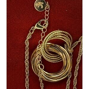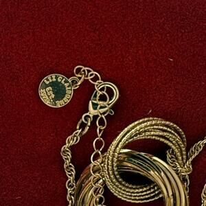 Liz Claiborne necklace adjustable 16 to 18 inches featuring multiple intertwined gold hoops hanging from the gold tone chain Lobster claw closure.