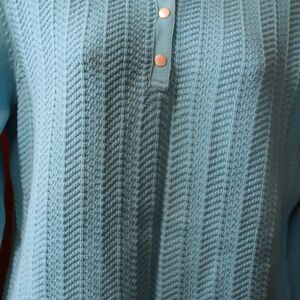 Liz Claiborne Villager XL teal blue henley turtleneck sweater. This cozy cotton pullover features a snap-button placket that converts the henley design into a full turtleneck. It offers versatile comfort, perfect for layering or wearing solo in an office or casual setting. Condition Note: Gently used with a small stain on the collar (priced accordingly; may lighten with treatment). Ideal for fans of vintage Liz Claiborne or those seeking a classic knit.