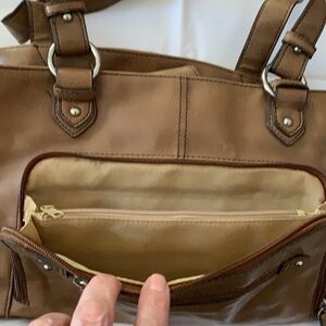 One small stain on the inside zipper section. Scoff area on the back, some wrinkles from not laying flat May work themselves out . Reduced for condition but has a lot of life left in it