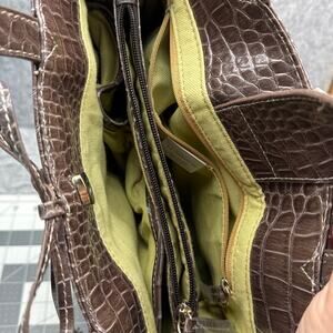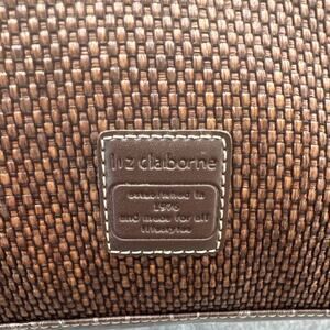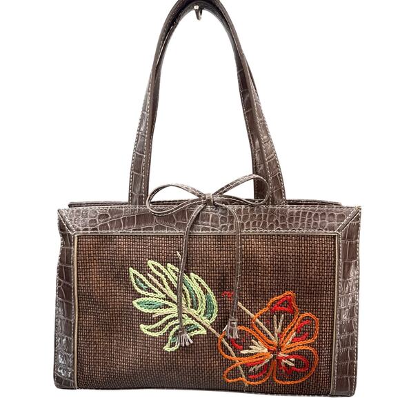 TAG WORDS: Liz Claiborne, Vintage, Brown, Woven, Straw, Floral, Embroidery, Satchel, Purse, Bag, Handbag, Shoulder Bag, Crocodile Embossed, Leather Accents, Unique, Stylish, Fashionable, Designer Bag, Pre-owned, Corydon Indiana