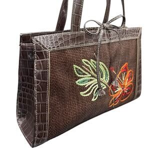This is a vintage Liz Claiborne brown woven straw and faux crocodile-embossed leather shoulder bag with beautiful floral embroidery. This bag is perfect for adding a touch of vintage charm to any outfit. The woven straw and leather accents create a unique and stylish look.