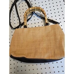 Liz Claiborne Vintage Straw Bag with Embroidery Design Bamboo Handles Cean