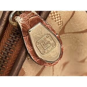 Brass logo pull zip closure with pockets inside and mirror on strap, very clean