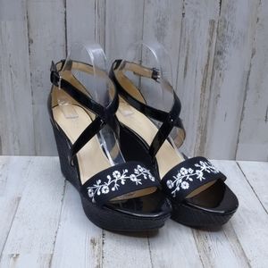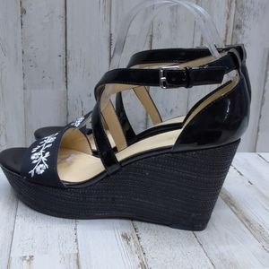 Black wedge sandals with white floral design in excellent pre-owned condition. Left shoe has a slightly picked spot on side. See photos for details.