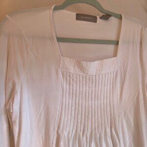 white blouse, pleated front, Liz Claiborne top, women's long sleeve, cotton blouse, casual shirt, elegant top, XL blouse, white tunic, breathable fabric, machine washable, square neckline, versatile blouse