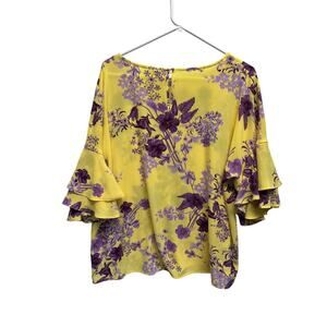 Liz Claiborne Women Blouse Ruffled Short Sleeves Yellow Purple Orchids Size XL