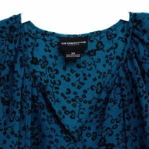 Liz Claiborne Women Blue Black Floral Print Blouse V Neck Flutter Short Sleeve XS