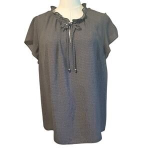 Soft and flowing blouse, black white herringbone pattern. Has a ruffle around neck with notch and tie.