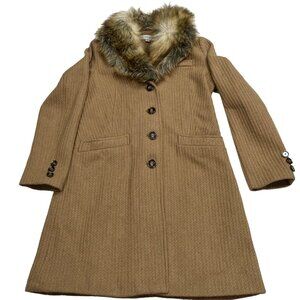 Crafted from a wool-poly blend, this tan coat features a cable knit texture with a removable faux fur collar.