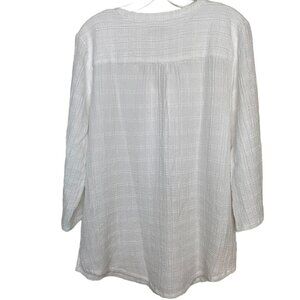 Elevate your wardrobe with this stunning Liz Claiborne women's tunic blouse. Crafted from a mix of rayon, polyester, and spandex, this blouse is lightweight, breathable, and stretchy, making it perfect for summer and spring. It features a Henley neckline and a pullover closure with casual sleeves that provide a relaxed fit for all-day comfort. This blouse is solid white with a beautiful crinkle texture and comes in a size L. It also has a collarless design and is packable, making it perfect for travel. The blouse is machine washable and non-iron, ensuring that it remains in great condition with every wash.