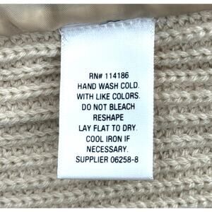 The front is lined faux fur and the back is a soft shaker knit sweater in a tan color which is ribbed at the collar.