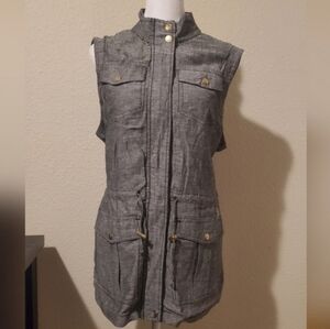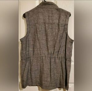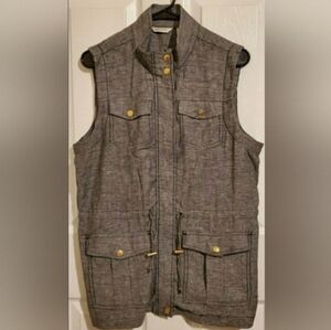 Liz Claiborne women's vest, gray vest, full zipper vest, women's fall fashion, casual vest, lightweight vest, fall layering, outdoor vest, women's vest with pockets, adjustable waist vest, fall wardrobe, women's outerwear, travel vest, versatile vest, casual chic vest, breathable linen rayon blend, women’s layering vest, stylish fall vest, women’s fashion vest, comfortable outdoor wear.