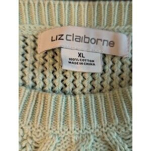 This Liz Claiborne sweater is a must-have for any fashion-conscious woman. The mint green color and cable-knit design make it a perfect addition to any outfit. With its long sleeves and round neckline, this sweater is both stylish and comfortable. Made from 100% cotton, this sweater is perfect for any season. Its XL size ensures a comfortable fit for women of all sizes. The pullover style and knit fabric type add to its overall appeal. This sweater is perfect for casual wear or even for dressing up for a night out.