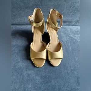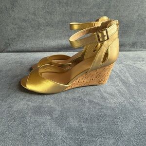 Liz Claiborne Womens Octavia Sandals 9.5 Gold Wedge Ankle Strap Cork New Open