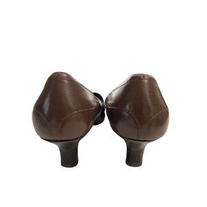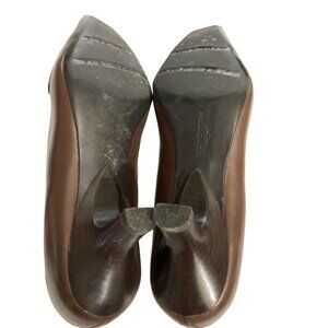 These Liz Claiborne heels feature a sophisticated brown leather design with subtle decorative elements. The medium heel provides elevation without sacrificing comfort, making them a versatile option for professional attire.