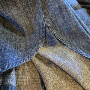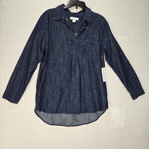 Liz Claiborne women's chambray top in dark rinse. High low hem has detail at the split. Button up long sleeve shirt with button cuffs. V-neck with collar and one front pocket. Faux button on neckline, round hem pull-on. New with tags.