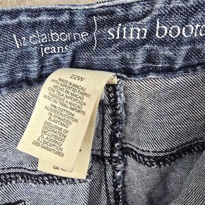 Liz Claiborne women's slim bootcut jeans in a dark wash, tailored for curvy sizes with a 22W fit. Crafted from a cotton-spandex blend for flexibility and comfort. Features include decorative back pockets, a mid-rise fit, and a subtle stretch for ease of movement. Excellent pre-owned condition with minimal signs of wear.