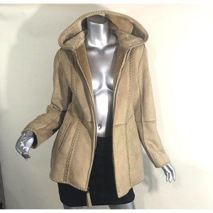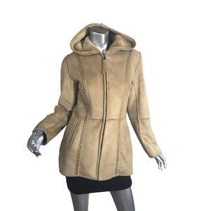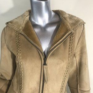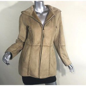Liz Claiborne Women's Small Tan Faux Suede Long Mid Length Coat Zip Up, Faux Fur Lined, Hooded with Pockets.. Excellent Condition!