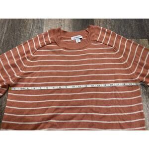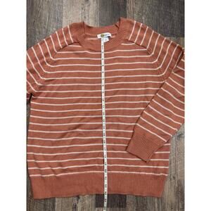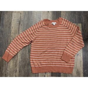 A stylish Liz Claiborne sweater featuring a warm rust color with white stripes. Made from a comfortable knit fabric, perfect for casual wear. It is a size medium.